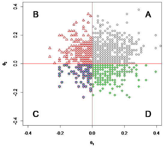 Figure 1 displays the scatter plot of the first MLEs of and for and . We can see that many pairs of and are in Zones B, C, or D, and those pairs are invalid MLEs due to or . Only the pairs of and in Zone A are valid due to the required conditions and .