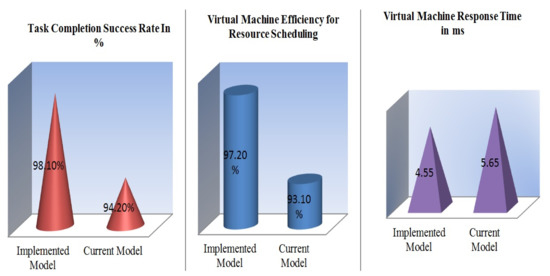 | Virtual Machine Efficiency For Resource Scheduling | In the existing models, average of resource scheduling is 93.10%. | In the proposed model, average of resource scheduling is 97.20%. | The success rate of resource scheduling is increased because more new tasks will be allocated to the virtual machines as per energy consumption. However, this work can be extended by considering the concept of clustering mechanism with optimization technique to find out the over- and underloaded VMs so that we can manage the task allocation properly. |