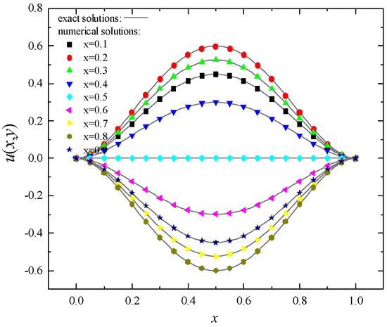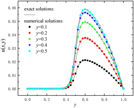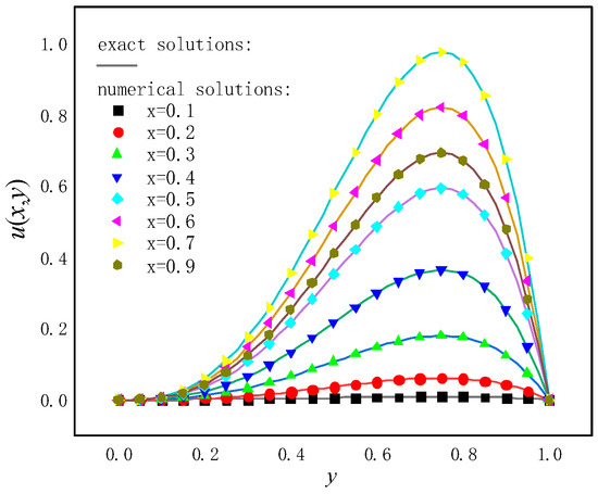 When 21 × 21 regular nodes distribution is used, and the parameters are , and , the numerical solutions solved by the DS-GIEFG method on the lines = 0.1, 0.2, , 0.9, are listed in Figure 2. We can see that the results of the DS-GIEFG method fit very well with the analytical solutions.