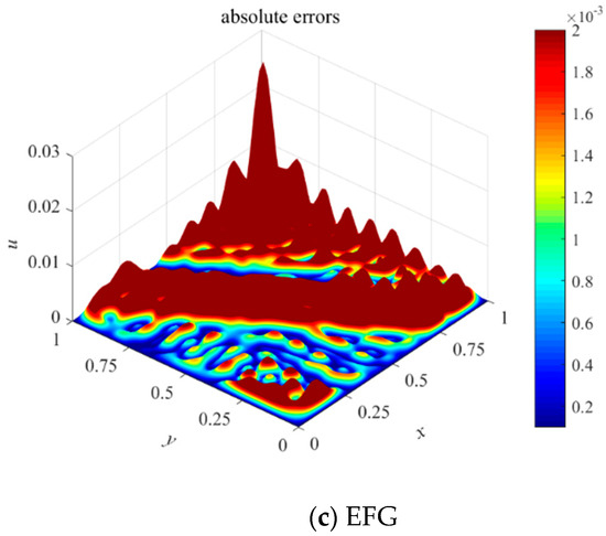 Absolute errors of the solutions solved by the (a) DS-GIEFG method, (b) VMEFG method and (c) EFG method with the same conditions of Figure 2.
