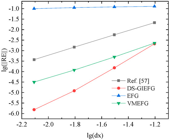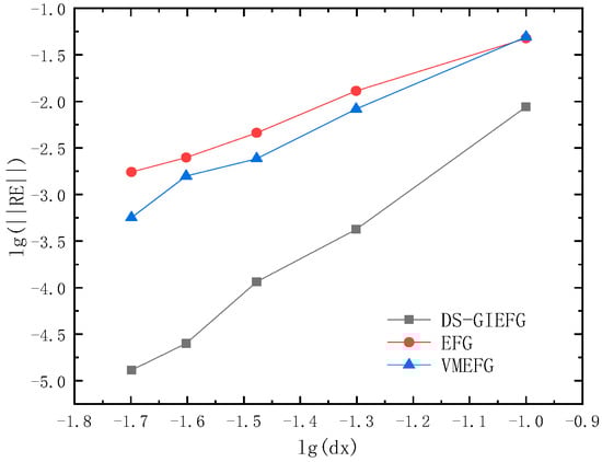 The variation of relative errors of the DS-GIEFG, VMEFG and EFG methods with respect to node spacing (in lg–lg scale).