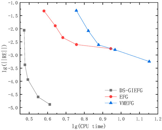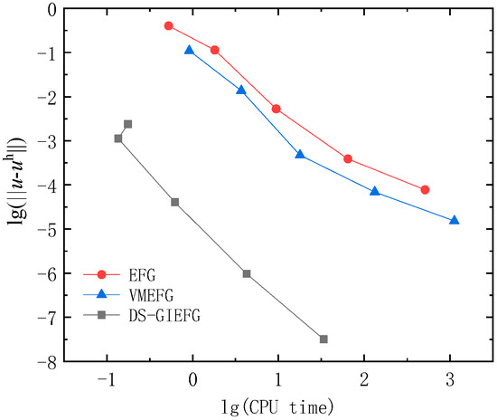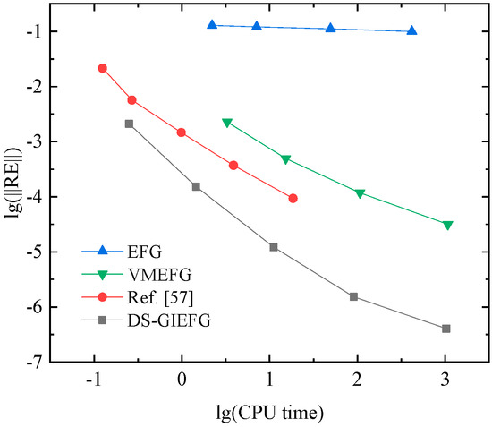 When the 17 × 17, 33 × 33, 65 × 65, 129 × 129 node distributions are used, the relative errors of the EFG, VMEFG and DS-GIEFG methods in the lg–lg scale are presented in Figure 9. The results of Ref. [57] are also listed in this figure. Additionally, the corresponding CPU time of these methods is plotted in Figure 10. For this example, there is no doubt that the DS-GIEFG method in this paper has higher calculation accuracy and efficiency.