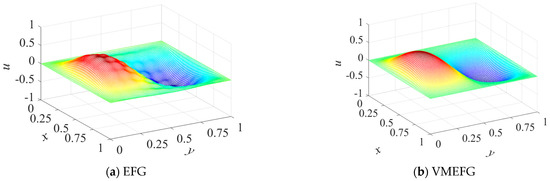 When the 9 × 9, 17 × 17, 33 × 33, 65 × 65, 129 × 129 nodes distributions are used, the errors of the Ref. [58], EFG, VMEFG and DS-GIEFG methods are listed in Table 1. Additionally, the corresponding variation of the errors with respect to the CPU time is shown in Figure 13. These results once again show that the method proposed in this paper has high computational accuracy and computational efficiency.