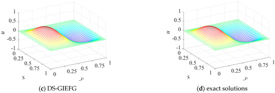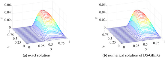 Let , . The other parameters are exactly the same as in Example 2. When using 51 × 51 nodes, the 3D surface of the exact and numerical solutions of the DS-GIEFG method are plotted in Figure 11. Additionally, the snapshots of solutions on the lines are shown in Figure 12. These two figures show that the solutions of the DS-GIEFG method are very consistent with those of the exact solutions.