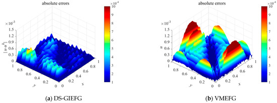 For comparison, the EFG and VMEFG methods were also used to solve this example, and the boundary conditions were enforced by the penalty function method with a penalty factor of . The influence scalar constants in the EFG and VMEFG methods are . Then, under the 21 × 21 regular nodes distribution, the absolute errors on the whole field are shown in Figure 3. Clearly, the solution of the DS-GIEFG method has better calculation accuracy than those of the other two methods.