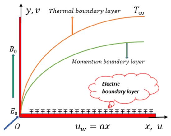 This study explored the steady, incompressible 2D MHD flow of non-Newtonian Casson fluid towards a stretchable sheet with the presence of electro-osmotic forces. The surface was stretched at and heated utilizing Newtonian heating. The was parallel to the stretchable surface and was normal to it (as shown in Figure 1). The governing boundary layer equation under the liquid flow and boundary layer assumption are presented in Figure 1.