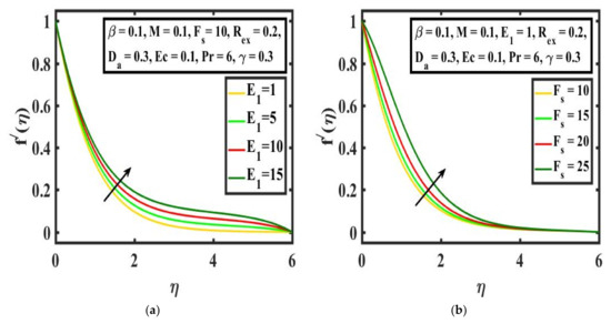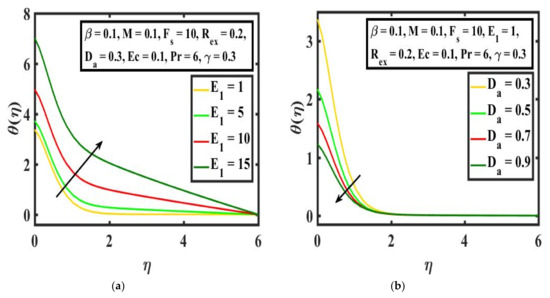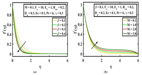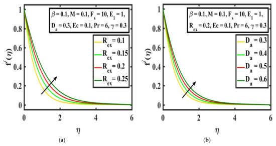 Figure 2a illustrates that as the is enhanced, the velocity curve and the thickness of the momentum boundary reduce. Figure 2b illustrates the impact of the Hartman number on the velocity curve . It was discovered that enhancing reduced the thickness of the momentum boundary layer and velocity estimation . This is because an increment in causes the Lorentz force to enhance, which restricts the flow. Figure 3a,b depicts that increasing and raises the thickness of the momentum boundary layer and the velocity estimation . The large values of and enhance the boundary layer velocity, as displayed in Figure 4a,b, whereas an increase in coincides with a decrease in viscosity, and the flow velocity grows. This is because greater values of decrease porosity, which causes the drag coefficient to decay, and hence, the velocity to be improved.