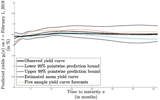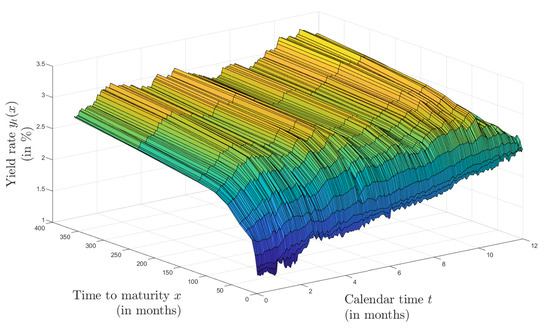 The rest of the paper is structured as follows. Section 2, Section 3 and Section 4 are meant to provide a concise review of the HJM framework and related results. With most of the results being scattered over a number of articles and monographs, our thrust was to give a coherent presentation on this matter with consistent terminology and notation to make the theory better accessible to a broad scientific and professional audience. In Section 2, a brief summary of the interest rate theory is given, in particular, a relation between the price of a zero-coupon bond and its instantaneous forward rate from Equation (1) is established. In Section 3, we introduce the abstract HJM model first presented and studied by [4,6], discuss major advantages of this approach and protocol some known well-posedness results. In Section 4, we summarize central properties of the abstract HJM model, in particular, we give sufficient conditions under which the abstract HJM model defines an arbitrage-free market, describe the long rates associated with the model, and give an example of a state space compatible with the instantaneous forward rate dynamics. Section 5 contains the main contribution of this paper. A (semi-)implicit numerical scheme is developed and applied to Equation (4). Using real data from the US Department of the Treasury [7], the resulting non-parametric model is calibrated using a custom-developed least-squares-like procedure involving principal component analysis (PCA) for parameter estimation and dimension reduction. The simplicity of our approach is one of its main advantages. Indeed, it does not rely on any sophisticated optimization techniques or third-party libraries, thus, making itself attractive and accessible to a wide audience. The model is then deployed to forecast future yield curve rates, estimate the mean future yield curve and compute prediction regions. Using the predictive power of the model as a benchmark measure in lieu of the mere calibration quality is another novelty of our contribution. To the best of our knowledge, this is the first time an infinite-dimensional model is applied to analyze the US Treasury’s daily yield curve rates. We refer [8,9,10] for the finite-dimensional treatise. In Section 6, conclusions are presented. Appendix A, Appendix B and Appendix C contain all seminal probabilistic and functional-analytic concepts and results [6,11,12,13,14,15] used in the article.