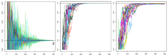 In this section, the different asymptotic behaviours for an allele of a Y-linked gene and its mutations obtained in the previous sections are illustrated by means of a series of simulated examples. First, we justify the values of the parameters chosen in the simulations that follow. The sex ratio is well-known not to be balanced but closed to 0.5, being less that 0.5 in some situations (see for example [10,11]) and greater than 0.5 in others (see [12,13,14]). We fix , since the case is mathematically more interesting. For the mutation rate, we take equal to . Although such value seems to be inflated related to actual values in nature as can be seen in [15], we consider that is adequate for the convenience of modelling the process. Moreover, with respect to the number of mating units at initial generation, we consider , which could represent Y-chromosomal most recent common ancestor with the nonmutant original allele (see for example [16,17,18]), and , since mutations appear randomly along time. Finally, Poisson distributions are considered as reproduction laws. This type of distribution is frequently used as offspring distribution (see for example [19,20,21,22,23,24]). The reproduction mean for -genotype is fixed taking a value of which is included in usual ranges for mammalian, for example in human (see the web page https://datos.bancomundial.org/indicador/SP.DYN.TFRT.IN). Those parameters verified that and , and then there exists a positive probability of coexistence of both genotypes. In order to illustrate the different behaviours on this event, we consider the following three specific and real scenarios depending on :