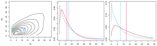 (Left) Contour plot showing the joint probability distribution of ( and its mean vector. (Middle) Comparison of the kernel density estimates of the density functions of (dashed line) and (solid line), jointly with their mean values (vertical lines). (Right) Comparison of the kernel density estimates of the distributions of (solid line) and (dashed line), jointly with their mean values (vertical lines).