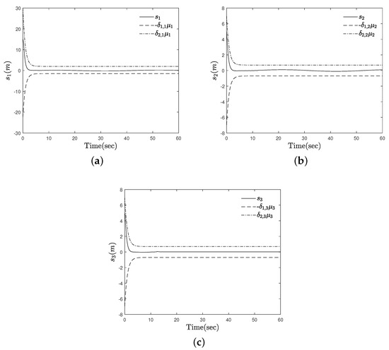 In the dynamics (2) of the torpedo-shaped UUV, the underactuated control torque vector should be designed. That is, the first, fifth, and sixth dynamic equations in (2) only have the control torques , , and , respectively. Thus, the the auxiliary stabilizing signals are required for the state equations for v, ω, and p (i.e., the second, third, and fourth dynamic equations in (2)). In this study, the auxiliary stabilizing signals , , and in (18) are presented to design the underactuated control torque vector while ensuring the predefined three-dimensional tracking performance and the stability of the closed-loop system. Because of these auxiliary stabilizing signals, the UUV dynamics (2) is stably controlled by using the only three control inputs , , and .