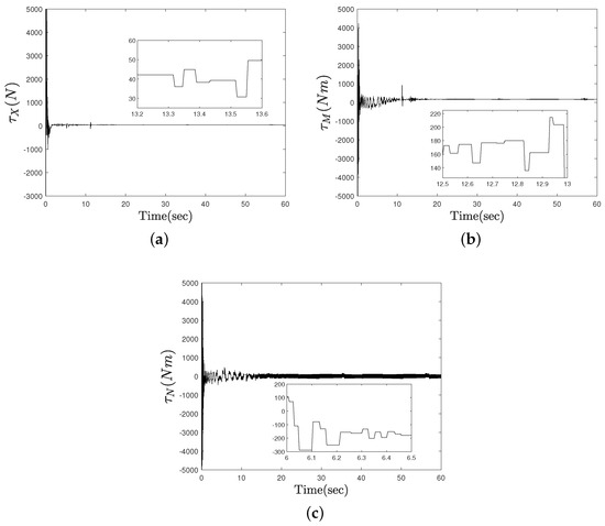 where ; and are the matrix of the rigid-body mass and the added mass, respectively, is a vector derived by the Coriolis and damping matrices, is a vector induced from the gravitation and the buoyancy of the UUV, and is a vector denoting the control forces and moments. In this paper, the torpedo-shaped UUV model is considered to deal with the tracking problem. The torpedo-shaped UUV cannot move directly to the y- or z-direction in the body reference frame and the roll movement is undesirable in the practical UUV [34]. Thus, the underactuated torque vector is considered in this paper. The detailed definitions of M, C, and G are presented in Appendix A. For more details for the model of UUVs, see [35,36].