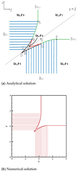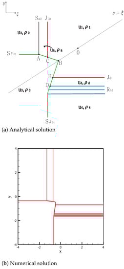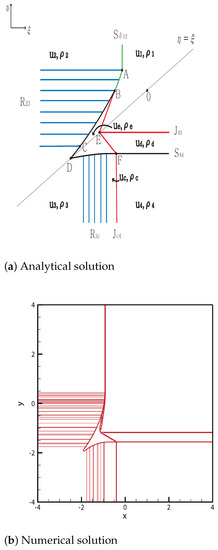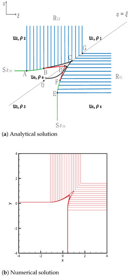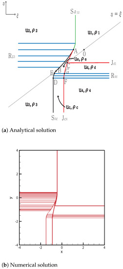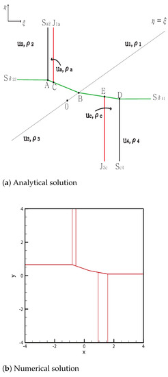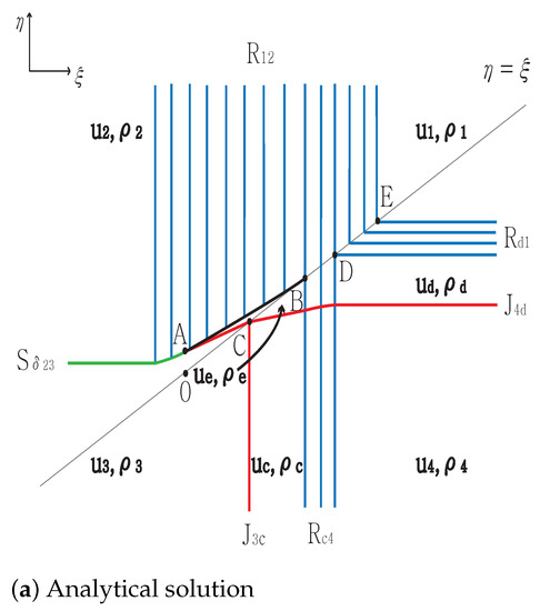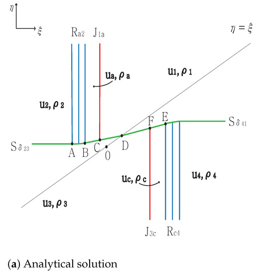 By contrast, meets at point and at the singular point D. Therefore, three contact discontinuities , and meet at their singular point D. The shock meets the rarefaction wave at point , and the curved shock continues toward C. Both rarefaction waves and meet at for between C and . The solutions are shown in Figure 11. The initial condition is