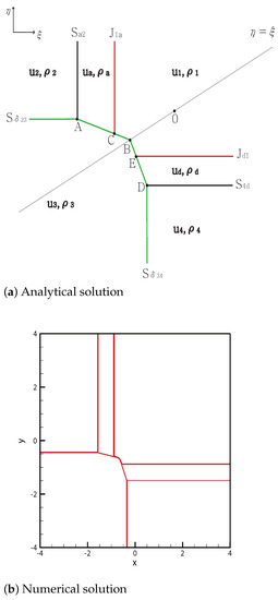 By contrast, the delta shock penetrates the whole rarefaction wave , and the straight delta shock from the point then meets at the point and continues to the singular point D. The solutions are provided in Figure 1 and show good agreement. The initial condition is , ,
