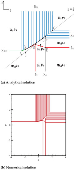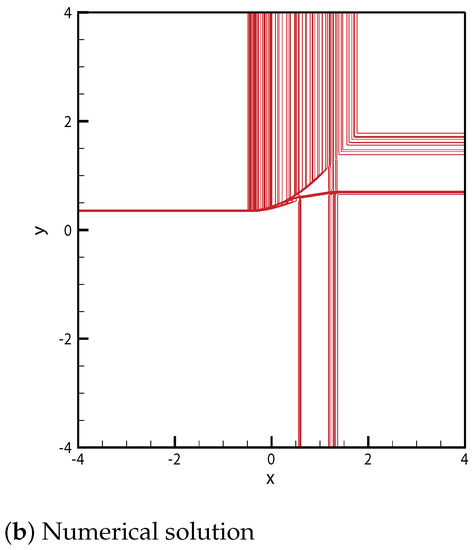 Because one of the fields of the system (9) is linearly degenerate, contact discontinuity appears as a solution of the RP. For the numerical solution, to reduce the numerical dissipations of the contact discontinuity, the flux functions of the semi-discrete central upwind scheme are modified. Further details can be found in [26,29,30]. In this study, the computational domain is and t = 0.2, for . We use 1200 × 1200 cells, and the CFL is 0.05.