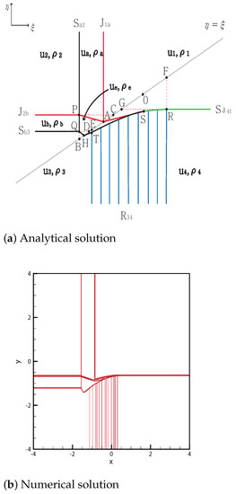 By contrast, the delta shock penetrates the entire rarefaction wave , and the straight delta shock from the point then meets the contact discontinuity at the point and continues to the singular point . The solutions are shown in Figure 6. The initial condition is