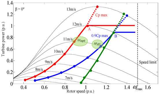 With Equations (24) and (22), various turbine power characteristics are determined as illustrated in Figure 7. The red one belongs to the maximum achievable power, in which the power coefficient is the highest available. The blue and green curves are the deloaded power curves. The blue curve represents a 10% deloaded power curve at each given wind speed, being able to extract when necessary a 10% of the maximum power for that wind speed. However, the green curve allows 10% of the maximum power to be extracted at any wind speed. The deload procedure decreases the efficiency of a wind turbine by raising the tip speed ratio. Thus, the deload curves shift to the right of the maximum power curve. Because of the increase in speed, kinetic energy is stored in the inertia of the wind turbine and is expressed as