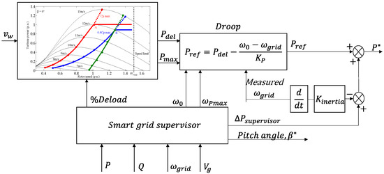However, working in this way wastes a large amount of wind energy at low speeds. In Figure 8, a diagram is shown for the generation of the active power reference to be introduced in the P* input of the DFIG control scheme presented in Figure 2. Figure 8 also includes droop control, inertial energy, and the pitch controller. The pitch controller will act when the active power surpasses the maximum deloaded power, the peak mechanical power or when the wind turbine speed is greater than the higher limit [39]. The control command is applied by the network supervisor for other control strategies such as automatic control of generation and energy flow or to limit the energy level to a specified level [20,40].
