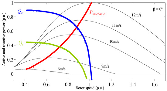 Figure 10 illustrates the red curve of maximum mechanical power that can be obtained for the specified wind speeds. The blue and green curves show the reactive power that the DFIG can provide to the grid when the generator is operating at rated rotor current.