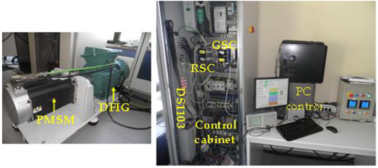 Figure 12 shows the picture of the real test bench for testing the suggested controlling solutions. The system consists of a 7.5 kW DFIM and a 10 kW synchronous machine (PMSM) that performs the tasks of a household wind turbine [42,43,44,45]. The probes for monitoring all the currents and voltages of the system are matched and wired to a DS1103 dSPACE [44] control system.