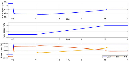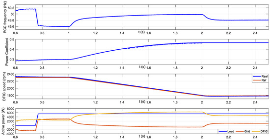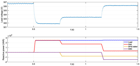 As shown in Equation (12), the reactive power through the stator is regulated by the rotor current d-component. When the load increases suddenly, not only does the frequency decrease, but also the amplitude of the grid voltage tends to be reduced. Because of that, the active and reactive power increases trying to correct the frequency and the amplitude of the grid voltage.