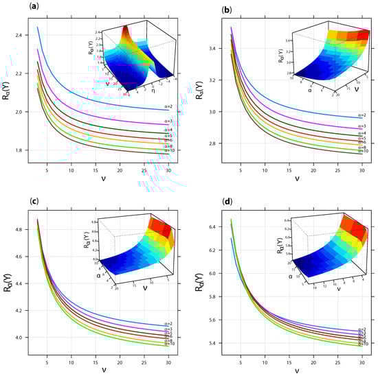 Skew-t Rényi entropy [] versus degree of freedom parameter () for cases (a–d) described above. Each line corresponds to order . 3d-subplot of case (a) corresponds to versus and , whereas the 3d-subplots of cases (b–d) are versus and .