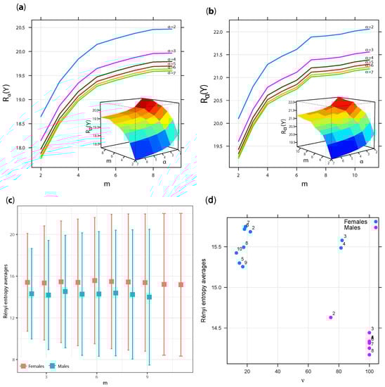 Figure 2a,b shows the upper bounds for Rényi entropies, for and 11 for males and females, respectively [6]. Upper bounds are obtained using the right side of inequality (21), where the parameters of each upper bound were replaced by their respective MLEs as plug-in type estimators [6,12,32]. In theses panels, the upper bounds for Rényi entropies are considered because it is necessary to detect the maximum information for given and m. Importantly, the values increase when the number of components increases for both genders. Only for males, the Rényi entropies increase until and then stabilize. For females, there exists a breakpoint at components; however, the information still increases to . For both genders, we can see that information is maximized for (quadratic Rényi entropy) and there also exist some differences between values. As in Section 2.2, the 3d-subplot illustrates similar behavior, where order is considered and the Rényi entropy decreases when increases.