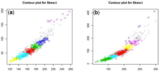 Let us consider the definitions of [5,7,28] for FMST distributions. The pdf of an m-component mixture model with parameter vector set : , a set of m location vector parameters , a set of m dispersion matrices , a set of shape vector parameters , a set of degree-of-freedom parameters, and with m mixing weights is