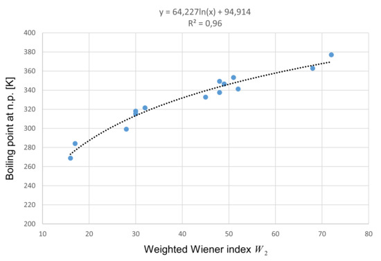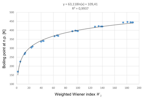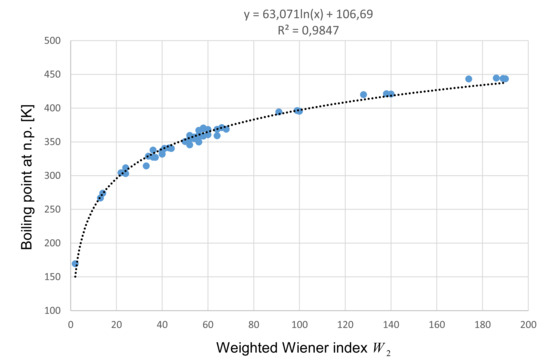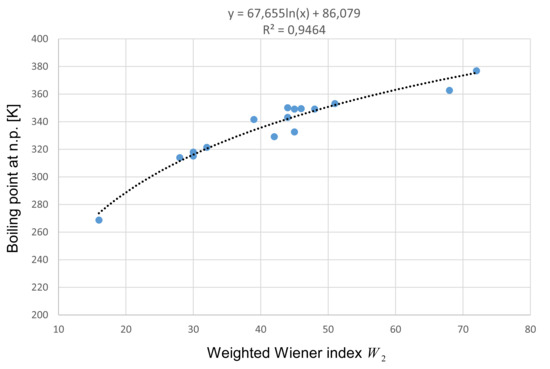 After performing regression analysis on all three weighted Wiener indices, it was established that the best results are obtained with the index . Therefore, we only present the results of the regression between the boiling points and . The obtained logarithmic function based on the training set can be seen in Figure 2. The predicted boiling point () can now be computed as