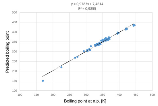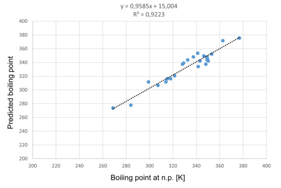 By applying Equation (2) we calculate the predicted boiling points and the corresponding residuals on the test set, see Table 4. Moreover, in Table 5 the mentioned data is provided for all considered alkenes. Finally, the graphical representation of boiling points and predicted boiling points is shown in Figure 3.
