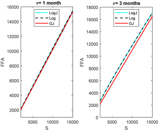 where and then the functions in (1) are , , and , with k, , and constants. A closed-form solution for the FFA price can be easily obtained replacing in (11).