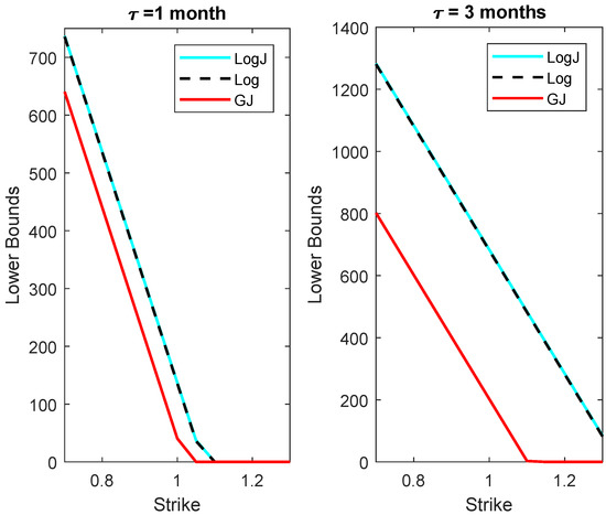 Lower bounds of freight options for and maturities of 1 and 3 months with the LogJ, Log, and GJ models.