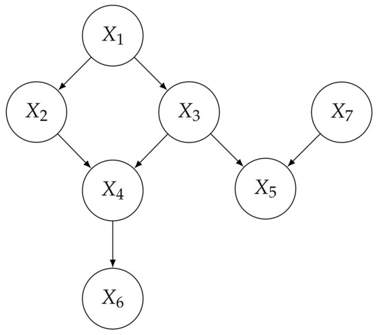 A Bayesian network is a compact representation of the joint probability distribution over a set of variables , whose independence relations are encoded by the structure of an underlying directed acyclic graph (DAG) [21,22]. Briefly speaking, a BN is defined as a pair , where G is a DAG and P is a set of conditional probability distributions (CPDs). G is composed of nodes that represent random variables (), and links between pairs of nodes representing statistical dependence. Each node has an associated probability distribution , where denotes the parents of in the DAG G. Attending to the factorization encoded in the DAG, the joint probability distribution over all the variables in the network is defined as the product of the CPDs attached to each node, so that