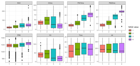 Figure 2 shows the distribution of the most frequently selected variables for each value of the air quality index (those selected in more than one model). For some predictive variables, differences among their distributions are noticeable (, , , , ). However, for other predictors (, , ), the distributions are rather overlapped, which might make the discrimination among the class values more difficult and, therefore, yield a worse classification performance. Nevertheless, even if some of these variables do not individually discriminate between the class states, they still help improve the classification performance when combined with others.
