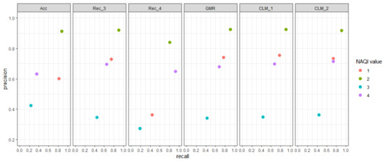 After the variable selection process, the models were fit again using the training set, restricted to the selected variables, and their performances were analyzed using the test set, in order to carry out an independent validation. The accuracy of each model over the test set is reported in Table 6, and the recall and precision for each class state and each model are reported in Table 7. The best accuracy, recalls, and precisions for class states 3 and 4 are highlighted in boldface. Figure 3 shows the pair precision–recall for each class state and optimized objective function, plotted from the figures in Table 7. Note that the higher and more to the right a point is, the better.