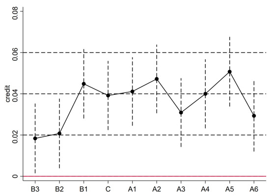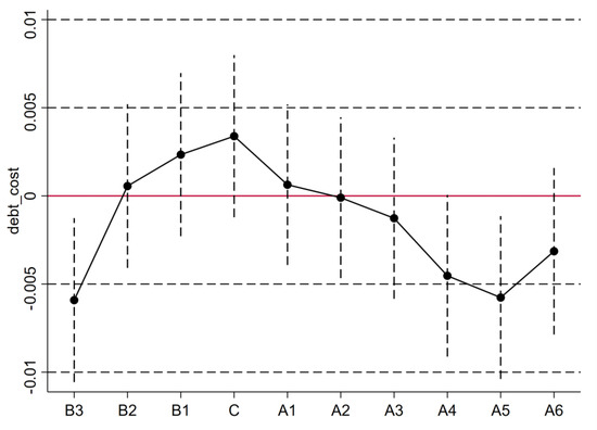 This paper adopts the DID, and its key assumption is that without the exogenous impact of the introduction of the “Green Credit Guidelines”, the loan amount and debt cost of the treatment group and the control group should maintain the same change trend. Therefore, we test whether the changes in the financing amount and corporate debt cost of the treatment group and the control group meet the parallel trend assumption before the “Green Credit Guidelines” are issued. According to this idea, taking the launch of the “Green Credit Guidelines” as a node, parallel trend tests are carried out on the changes in the loan amount and debt cost of companies. The results are shown in Figure 2 and Figure 3. As can be seen from the figure, the models of the two dimensions of loan amount and financing cost both meet the parallel trend assumption of the DID.