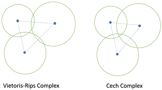 In geometry, a simplex is a general concept of a fully connected shape in any dimensions, where a k-simplex is a k-dimensional polyhedron of vertices. As an example, a disk can be simplified and assimilated to a 0-simplex, while a circle is distinguished as a chain complex with a one-dimensional hole. Two different strategies are used to construct simplex-based structures for computational purposes in homological data analysis. In a so-called Vietoris-Rips complex, two nodes are said to be connected to each other if their neighborhoods (balls around the node) overlap, thus making the polytope a simplex. In a Cech complex, a simplex is, on the other hand, defined if and only if any given node is connected to any other nodes with overlapping of all neighbors. Therefore, a simplex in a Cech complex is a stricter connection in any dimension. These simplices are illustrated in Figure 1.