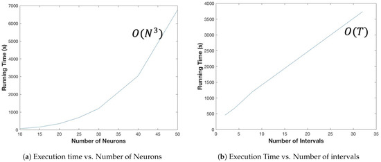 The computational complexity is defined as the execution time of our program which is, in turn, dependent on the number of nodes N as well as on the number of time intervals T. We fix all other parameters and vary the choice of N and T, respectively, to discuss our model’s complexity. The results are shown in Figure 2.