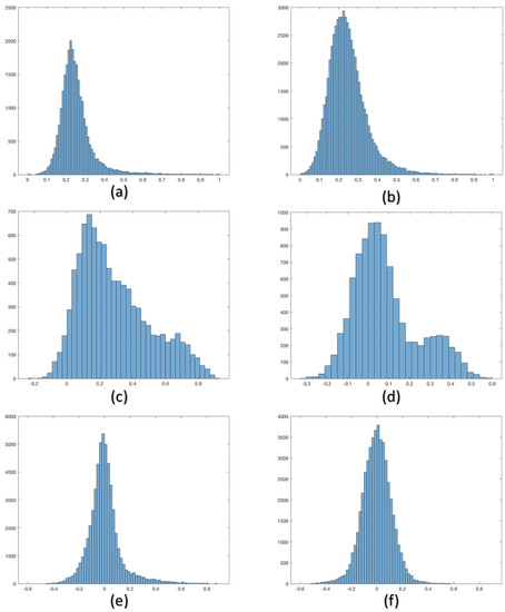 To first evaluate the viability of the proposed model, we qualitatively show the behavior of the model’s respective densities and of the real data in Figure 3. We also show the degree of correlation between the neuronal data for various trials and the degree of the correlation between different neurons in the same trial. The original intensities, X-axis, are all normalized between 0 and 1 using , Y-axis presents the number of times that the values occurred within the intervals set by the X-axis. The results are shown in Figure 3.