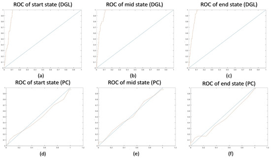 ROC curve: (a–c): ROC curve for our model (DGL) in different states. (d–f): ROC curve for using the Pearson correlation (PC) in different states.