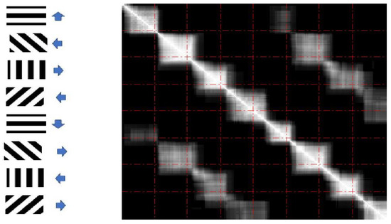 A graph correlation is obtained by way of cross-correlating the duly vectorized weight matrices, e.g., the element value of i-th row and j-th column of the matrix stands for the correlation between i-th and j-th graphs’ weight vectors, and the matrix is symmetric. The red dash lines divide the plot of Figure 7 into small blocks, representing the exact time interval corresponding to each specific stimulus shown on the left of the plot, and Figure 7 provides an intuitive view of the memories (time delay) between consecutive stimuli and similarities of graphs activated by similar stimuli.