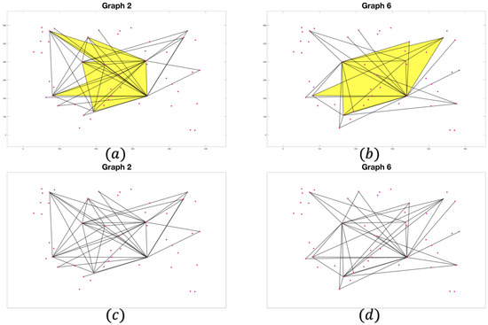 Comparison between related stimuli with and without simplex information: Second and sixth stimuli are related stimuli. The yellow triangle stands for 2-simplex connections. (a) The graph representation for the second stimulus with simplex information. (b) The graph representation for the sixth stimulus with simplex information. (c) The graph representation for the second stimulus without simplex information. (d) The graph representation for the sixth stimulus without simplex information.