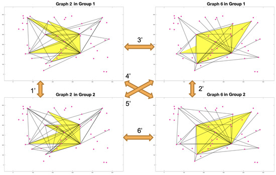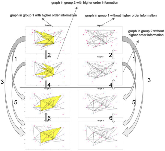 Figure 9 and Figure 10 show all the correlations calculated in the experiments for pairwise connectivity and 2-simplex connectivity. In Figure 9, the 2 subplots in the first row are graph representations with and without 2-simplex connections for one stimulus in the first group; the 2 subplots in the second row are graph representations with and without 2-simplex connections for the same stimulus in the second group; the 2 subplots in the third row are graph representations with and without 2-simplex connections for the related stimulus in the first group, and the 2 subplots in the fourth row are graph representations with and without 2-simplex connections for the related stimulus in the second group. The marked numbers in Figure 9 represent 6 correlations for pairwise connectivity, which are: (1, 5): correlations between pairwise connection under related stimuli in the same group; (2, 6): correlations between pairwise connection under the same stimulus in different groups; (3, 4): correlations between pairwise connection under related stimuli in different groups. The marked numbers in Figure 10 represent 6 correlations for 2-simplex connectivity, which are: (1’, 2’): correlations between 2-simplex connection under the same stimulus in different groups; (3’, 4’, 5’, 6’): correlations between 2-simplex connection under related stimuli within each group or in the different groups. Table 3 shows all the correlations between graph representations without simplex information. Table 4 shows all the correlations between graph representations with simplex information, and Table 5 shows all the correlations between 2-simplex connections. We run the program 20 times and calculate the mean value of correlations.