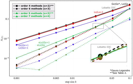 Methods eLs|Gs and eLs|Gs+1 produced equivalent results in the analyzed example, as evident in Figure 1. Although they are of higher order (5 and 7) than the rest, they employ the same number of coefficients per variable (except Lobatto IIIC, which has a coefficient more than Gs|Gs at a given order of accuracy). For example, Gs|Gs of order 4 (G2|G2) employs two coefficients per variable, matching eLs|Gs at order 5; G3|G3 is of order 6 and employs three coefficients per variable and so does eL4|G4 at order 7. Although these methods share the same number of coefficients per step, a significant advantage of the “e” methods is observed.
