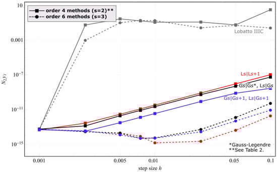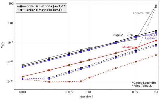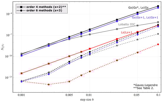 The examples are integrated by Gs|Gs, Gs|Gs+1, Ls|Ls+1, Ls|Gs, and Ls|Gs+1 for stages , which have orders of accuracy 4 and 6, respectively (Table 2). For comparison, we also analyzed the examples with the Lobatto IIIC method of the same orders of accuracy, 4 and 6.
