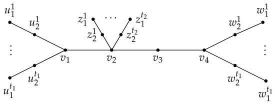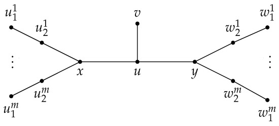 Let be the tree obtained from by subdividing the edge with a subdivision vertex u and adding a new vertex v and a new edge (see Figure 3). It is not hard to see that , and . Therefore the bounds of Theorem 1 and Proposition 2 are sharp for any tree in the family .