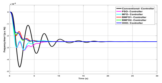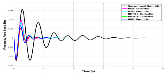 Dynamic response of Area1 frequency with respect to time in seconds with various controllers like conventional, PSO, MFO, BMFO1, BMFO2, and HHO under bilateral contract are compared in Figure 9 and Table 9. The comparative outcomes obtained show improved results of the HHO controller with delay time −0.835 s and settling time of 20.86 s.