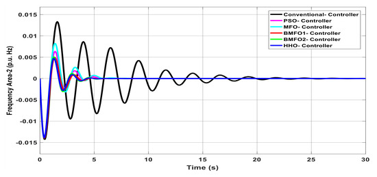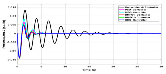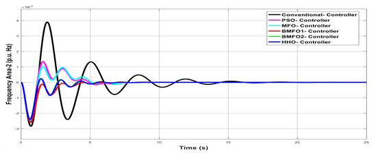 Dynamic response of Area2 frequency with respect to time in seconds with various controllers like conventional, PSO, MFO, BMFO1, BMFO2, and HHO under contract violation case are compared in Figure 16 and Table 16. The comparative outcomes obtained show improved results of the HHO controller with delay time 0.0023 s and settling time of 20.86 s.