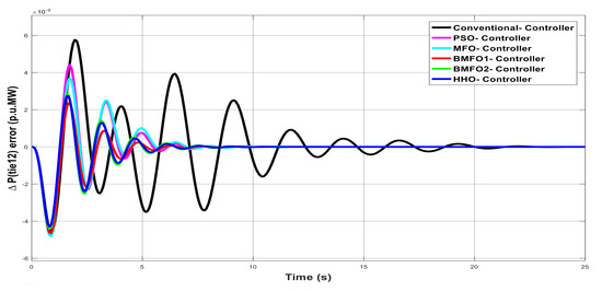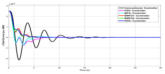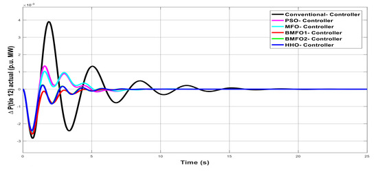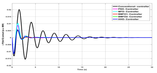 Dynamic response of deviation in actual tie-line power flow with respect to time in seconds with various controllers like conventional, PSO, MFO, BMFO1, BMFO2, and HHO under contract violation case are compared in Figure 17 and Table 17. The comparative outcomes obtained show improved results of the HHO controller with delay time 0.0029 s and settling time of 20.86 s.