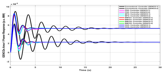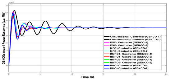 Dynamic response of GENCOs to DISCOs generation of Area1 with respect to time in seconds with various controllers like conventional, PSO, MFO, BMFO1, BMFO2, and HHO under contract violation case are compared in Figure 19 and Table 19a. The comparative outcomes obtained show improved results of the HHO controller with delay time 3.006 s and settling time of 20.86 s.